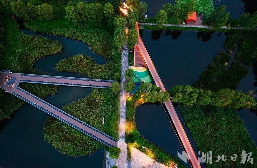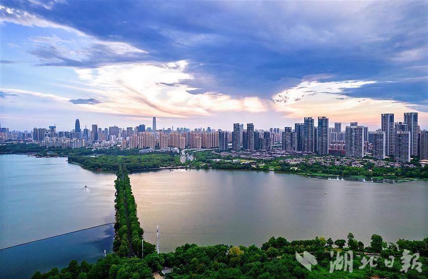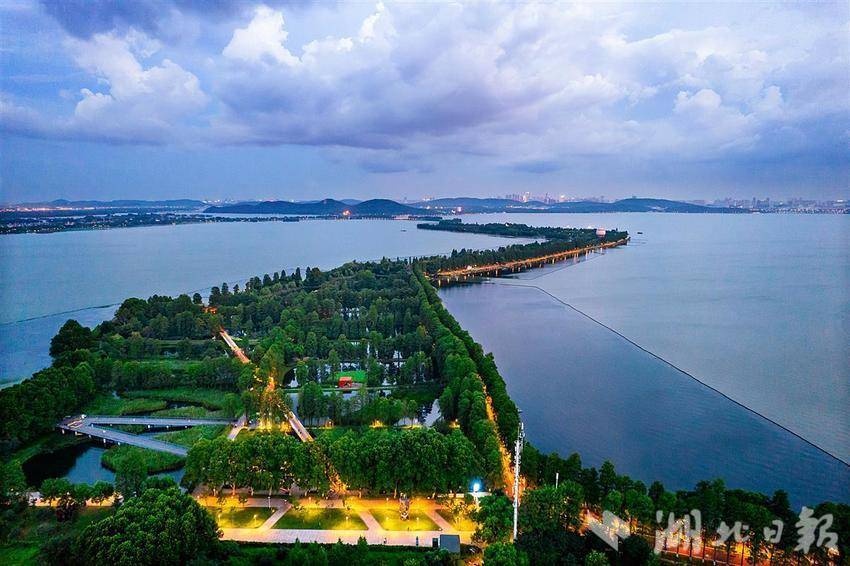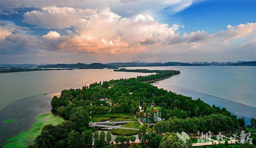 7月27日傍晚,鸟瞰武汉东湖国家湿地公园。近年来,该公园通过大力推动水生植物种植来改善水环境治理、山体修复、动植物保护等生态措施,净化空气,减轻热岛效应,保证生态环境可持续发展,将公园建成开放式的生态博物馆,成为当地居民的乐园。(湖北日报全媒记者 朱熙勇 摄)