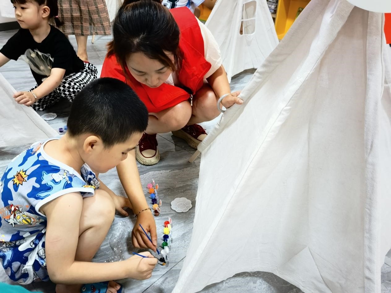安全教育讲座结束后,巾帼志愿者还带着孩子们一起绘制“我的梦幻城堡”。孩子们在洁白的帐篷上尽情展示自己的想象力,他们认真调色、涂涂画画,通过手中小小的画笔施展“魔法”,你一笔我一笔,将心中五彩斑斓的世界绘制在帐篷上。家长们陪伴在侧,关注着孩子们的一笔一画,轻声指导着,现场气氛热烈,亲子间其乐融融。