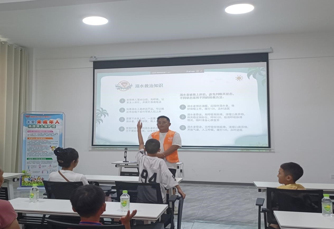随后,巾帼志愿者带领孩子们一起学习夏季防溺水“六不准四牢记”,提高未成年人自我保护能力和危险识别能力。医护志愿者现场为大家讲解遇溺水事故时的自救和互救方法,包括抱膝式、心肺复苏急救术中的人工呼吸与胸外按压等,并邀请孩子们亲自上台实践感受。志愿者们还通过生动形象的案例,为孩子和家长讲解文身危害,帮助孩子树立正确的审美观、人生观、价值观。同时,为家长发放《未成年人文身治理相关规定》宣传页,引导家长及时履行监护职责,形成教育合力,全方面护航未成年人身心健康。