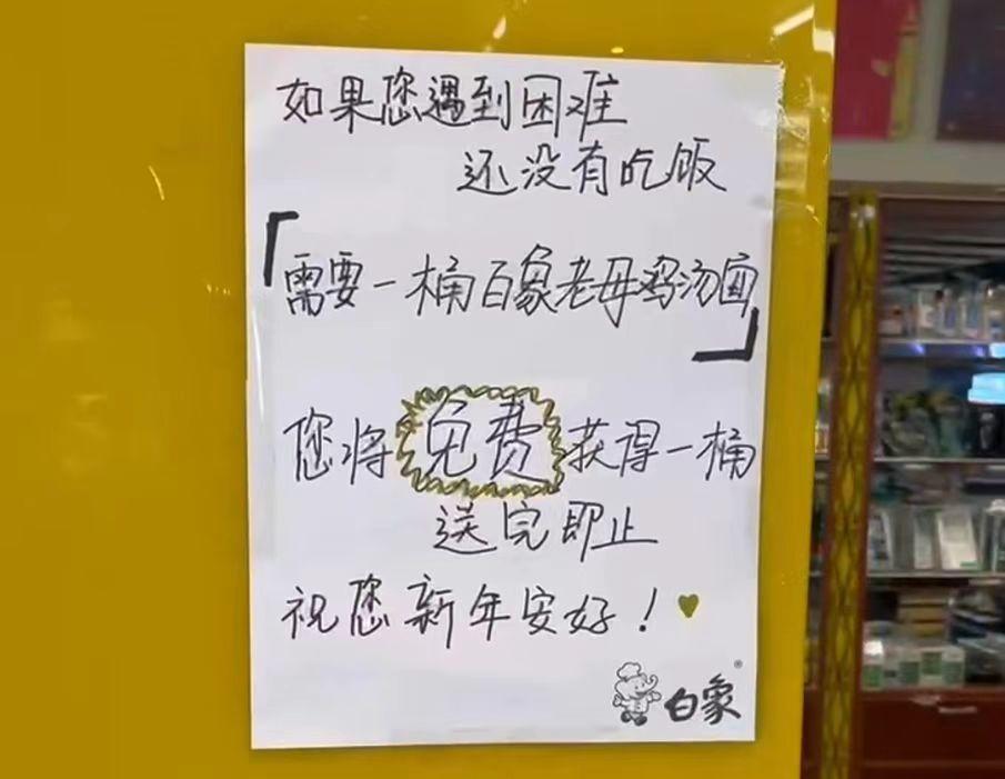 “如果您遇到困难,还没有吃饭,请您告诉我们需要一桶白象老母鸡汤面,您将免费获得,祝您新年安好。”
